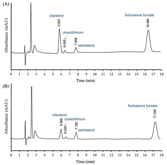 Figure 2 shows the chromatographic system for analysis of FF/UMEC/VI with standards and salmeterol as an internal standard. The results indicated that the analysis system was accurate and precise with 98–101% for VI, 97–99% for UMEC, and 98–101% for FF recovery, and the percent coefficient of variation was 1.1–1.8. The linearity over 2–12 µg/mL of all three drugs was 0.9985–0.9995, which was within the acceptable range. The retention times of VI, UMEC, FF, and salmeterol were 5.8, 6.5, 7.8, and 16.5 min, respectively. The chromatograms of the standards were similar to the samples (Figure 2).