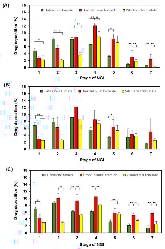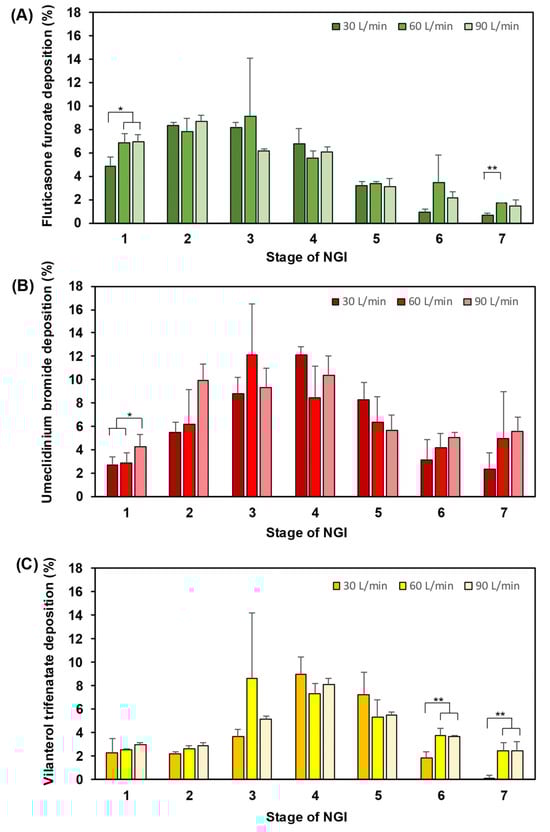 Aerodynamic particle size distributions of vilanterol trifenatate (green bar), umeclidinium bromide (red bar), and fluticasone furoate (yellow bar) from the TRELEGE ELLIPTA™ DPI inhaler operated with the Next Generation Impactor (NGI; USP Apparatus 6) at different air flow rates of (A) 30 L/min, (B) 60 L/min, and (C) 90 L/min. Significance by Tukey test was defined as p-value < 0.05 (*) or p-value < 0.01 (**).