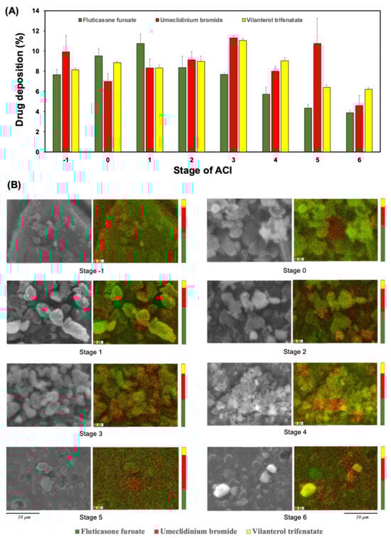 The eight-stage Andersen cascade impactor (ACI) was used to characterize the deposition of each drug component at 60 L/min for 4 s. Determination of the distribution patterns at each stage was conducted using scanning electron microscopy (SEM) and an energy-dispersive X-ray (EDX) analysis system. Double adhesive discs (3M, Bangkok, Thailand) were prepared and placed on each collection plate to trap the particles that lost momentum. The ACI was operated at 60 L/min for 4 s. The drug deposited on each stage of the ACI was collected for observation under SEM–EDX. The SEM–EDX analysis of each stage of the impactor (stages −1, 0, 1, 2, 3, 4, 5, and 6) was conducted for each drug component. The three drugs, FF, UMEC, and VI, were mapped in green, red, and yellow, respectively, from the EDX analysis. The experimental diagram of this section is also shown in Figure 1B.