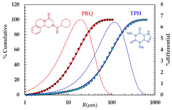 Particle size distributions were calculated according to Mie theory [41] by means of the following refractive index values: 1.330 for silicone oil, 1.360 for water, and 1.700 for theophylline and praziquantel. For mathematical modeling purposes, we hypothesized that particles were spherical. The cumulative PSDs referring to the TPH and PRQ are reported in Figure 1.