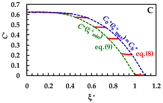 In detail, over Figure 3A, the first red line on the right refers to the drug concentration profile at the beginning (t = 0) of the dissolution process. Vertical dashed and dotted lines indicate the dimensionless BL thickness (δ+ = D × kd/ξmin-0). Thus, the lowermost part of each profile shows the end of the BL (ξ = ξmax), while the uppermost part indicates the beginning of the BL defined by the solid–liquid interface (ξ = ξmin). As the dissolution proceeds, the drug profile concentration moves on the left, as well as particle radius (ξmin) reducing up to the end of the dissolution (particle disappearing). Furthermore, δ+ reduces as dissolution proceeds, according to the distance separating dashed or dotted vertical lines. Considering that wettability issues do not occur, the dimensionless drug concentration at the solid–liquid interface (dashed green line, C+(ξ+min) = C/Cs) is equal to one, except at the end of the dissolution, when it almost merges to M0/(V × Cs), set to 0.625 in our simulations. Thus, drug concentration at the solid–liquid interface is equivalent to drug solubility in the dissolution environment Cs. The blue dashed line represents the trend of the dimensionless drug concentration at the end of the BL, which, according to Equation (6), equals the dimensionless bulk drug concentration Cb+. Therefore, Cb+ starts from zero and terminates at the final value of 0.625 (=M0/(V × Cs)). When solid wettability decreases (Figure 3B; 0.2 < (km/kd) < 3), drug concentration at the solid–liquid interface (ξ = ξmin) is never equal to one (see dashed green line), and thus the concentration gradient across the BL is lower, leading to slower dissolution kinetics. Finally, when wettability issues are relevant (Figure 3C), the dimensionless drug concentration at the solid–liquid interface (dashed green line, C+(ξ+min)) increases with a monotonic trend from zero up to the final value of 0.625. Therefore, the concentration gradient across BL is fading and the kinetics of the dissolution process are strongly decreased. Overall, the analysis of Figure 3A–C reveals some important theoretical features of the proposed model, i.e., that the evolution of the BL thickness δ+ is not affected by solid wettability. On the other hand, it influences the drug concentration profile inside BL, hence the drug concentration at the solid–liquid interface (ξ = ξmin).