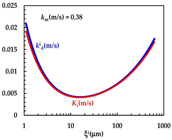 Figure 4 shows the model’s best fitting (solid line) to experimental DRT data (symbols) referring to TPH. In detail, TPH monohydrate is stable in the aqueous dissolution environment. Indeed, it does not undergo re-crystallization upon dissolution. Consequently, the profile concentration does not show the usual slope reduction at the beginning, induced by the solubility reduction [18]. The data fitting is very accurate, and the values of the two model fitting parameters read α = 27 and km = 0.38 m/s. The fact that α is >1 involves a “disengagement” from the original D’Arcy and Persoons equation for the evaluation (Equation (7)). Thus, we conclude that the relative velocity between particles and fluid is greater than that proposed by D’Arcy and Persoons. This is not surprising as their approach, although very useful and smart, represents an approximation of what really occurs between particles and a dissolving fluid. Moreover, it is worth mentioning that their theory refers to spherical particles, while TPH particles appear as solid bodies, i.e., parallelepipeds [20]. The comparison between km, (Equation (7)) and Ki (Equation (12)), shown in Figure 5, reveals that km is >>; thus, the overall mass transport coefficient Ki almost matches with . Essentially, the most important resistance to TPH dissolution is represented by the existence of the BL surrounding each particle, whose thickness is strictly connected to the hydrodynamic conditions of the dissolution medium. Thus, the analysis of DRT data by means of the proposed model reveals that TPH is not affected by wettability problems.