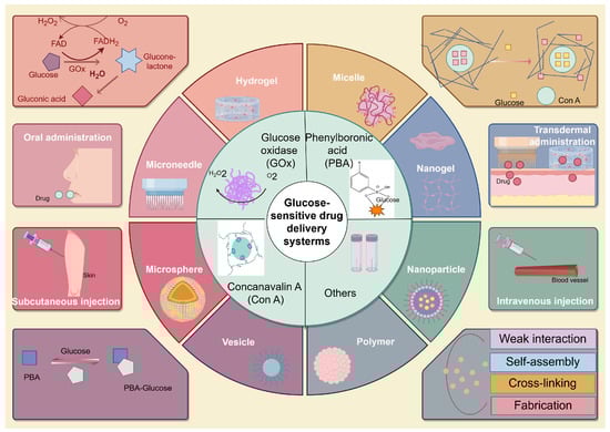 The drug delivery system (DDS) is an example of the research into new dosage types in modern pharmacy and is the crystallization of the development of current discipline and technology. DDS has produced large developments in continuous-release, percutaneous, and marked drug delivery systems [4,5]. The glucose-responsive drug delivery system acts as an innovative move toward diabetes. It could release medication in response to changes in glucose position in the physique, hence continuing their lifeblood sugar position within a usual series. The system typically consists of two practical parts: a glucose faculty part (which discovers changes in glucose attention in the physique) and an insulin shop and set-free component (which is to blame for storing and later setting insulin free). Combining these components into one system allows for more precise control of the delivery of hypoglycemic drugs such as insulin. It can reduce the risk of hypoglycemia and enhance the overall management of diabetes. They could offer significant advantages over traditional insulin therapy, potentially changing the treatment landscape for diabetes [6]. In the existing literature, three kinds of glucose-sensitive materials have been considered most widely—glucose oxidases (GOx), phenylboronic acid (PBA), and Concanavalin A (Con A). All of these could interact with glucose in a particular way and cause changes in microenvironmental state or substance. At the same time, nanospheres, micelles, vesicles, hydrogels, and nuclei have been successfully designed as medication carriers for diabetes.