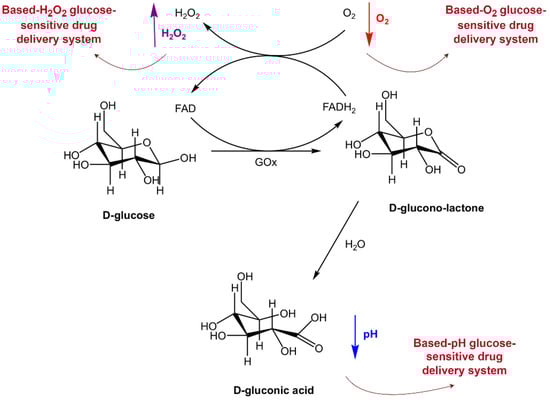 GOx is a glucose response system that is widely used. It is an oxidoreductase that particularly catalyzes β-D-glucose. The drug delivery system based on GOx is a homodimer that uses the Enzo subunits with a relative molecular lot of 80 kDa, each compulsory a flavin adenine dinucleotide coenzyme [21]. When combined with a pH-responsive polymer material, GOx catalyzes glucose to produce gluconic acid in a hyperglycemic environment. It can change the pH of the microenvironment. It can bring about a conformational or constructional alteration in the carrier, which facilitates the release of the preloaded medication. Concurrently, the consumption of O2 causes the GOx to form an in-situ hypoxic microenvironment, which causes a reduction reaction of some components of the carrier. It can ruin the medication-filling system to release the preloaded drug [22]. In the GOx-based glucose-sensitive drug delivery system, the release of insulin or other hypoglycemic drugs is affected via the glucose in the blood. GOx uses O2 as an electron acceptor to catalyze glucose and swiftly consumes O2 to cause gluconic acid and hydrogen peroxide (H2O2). The pH of the microenvironment and O2 thinking drops, and H2O2 attention rises after the oxidation of glucose (Figure 3) [23]. These changes in pH, H2O2 concentration, and oxygen levels could act as triggers to initiate drug release from the delivery system. The glucose-sensitive dynamic action of glucose oxidase causes a response in the system. Therefore, GOx was introduced into carriers with pH response, O2 response, and H2O2 response to prepare the glucose-responsive drug delivery systems. Table 2 summarizes the drug delivery systems based on GOx developed over the past decade, including pH, H2O2, and O2-sensitive systems. It might be related to the principle of glucose oxidase. Currently, multi-system combined technology has been applied. It could learn from strengths and weaknesses to give full play to the value of GOx and enhance the application to the detection and treatment of diabetes [24].