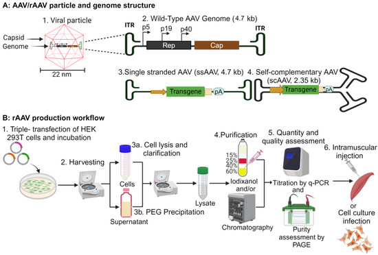 AAV-derived vectors (rAAVs) can be generated by replacing the rep and cap genes with a transgene of interest [13,14]. rAAVs mainly exist in two types: self-complementary AAVs (scAAVs) and single-stranded AAVs (ssAAVs). The transgene expression of scAAVs is quicker than ssAAVs, as the ssAAV genome requires the conversion to double-stranded DNA before transcription. The transgene capacity of scAAVs is 2.35 kb, which is half the size of ssAAVs (Figure 1A) [15,16]. The common workflow for rAAV production uses three plasmids, the AAV genome bearing plasmid engineered to carry the transgene, the AAV cap bearing plasmid and the helper plasmid bearing the adenoviral genes. These are co-transfected into HEK293T cells. Following viral replication, both the cells and supernatant are harvested for cell lysis and concentration by polyethylene glycol (PEG) precipitation, respectively. The clarified lysate and the precipitated virus are mixed and purified by iodixanol gradient ultracentrifugation and/or chromatography. Following quantification by q-PCR and purity analysis by polyacrylamide gel electrophoresis (PAGE), the vector can be used for in vitro studies or animal experiments, where intramuscular injection is the most commonly used route (Figure 1B) [17].
