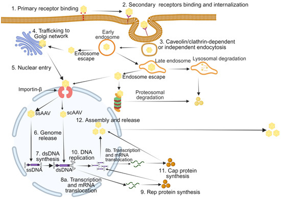 Similar to the wild-type AAV, rAAVs enters the cell by attaching to serotype-specific primary and secondary receptors on the cell surface [18,19]. AAVR (adeno-associated virus receptor), a type I transmembrane protein, is known to stabilize the attachment of most AAV serotypes to the cell surface [20]. This facilitates internalization, mainly by clathrin-mediated, caveolin-mediated, or clathrin-independent endocytic pathways. Once inside the cell, rAAV particles are sorted through early endosomes (EEs), late endosomes (LEs), and the Golgi apparatus [18]. Efficient transduction requires trafficking to the Golgi. Exposure to an acidic environment in the endosome allows for viral escape into the cytoplasm. If this fails, AAVs can be directed to lysosomes for degradation. Endosomal escape is followed by translocation to the cytosol before entering the nucleus via nuclear pore complexes, often facilitated by importin-β. Some rAAV vectors are marked with ubiquitin, signaling their degradation by the proteasome. Once in the nucleus, the AAV genome is released from the capsid. The single-stranded DNA genome is converted into double-stranded DNA, which can serve as a template for the synthesis of transcripts that are translated to rep proteins. Rep proteins mediate genome replication, and newly synthesized double-stranded genome copies serve as templates for the synthesis of RNAs that are translated into capsid proteins. This is followed by viral assembly and release (Figure 2) [18].