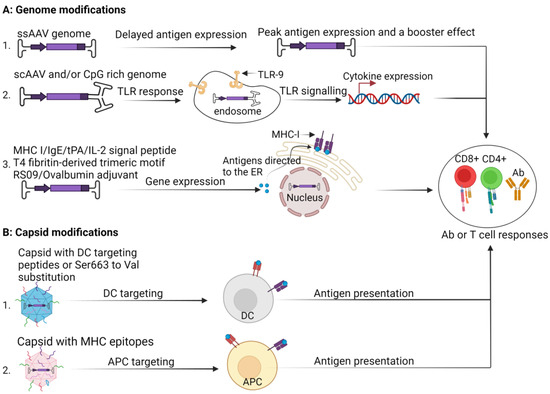 AAV modifications to enhance immunogenicity. (A) Genome modifications. AAVs carrying single-stranded AAV (ssAAV) allow the capsid to act as an adjuvant before ssAAV achieves full antigen expression to boost the vaccine effect (1). Self-complementary AAVs or any genome conformation carrying unmethylated CpG islands are recognizable by Toll-like receptor-9 (TLR-9) receptors, whose signaling leads to pro-inflammatory cytokine response (2). Incorporation of sequences encoding various signal peptides, including MHC-I trafficking signal peptide, IgE/IL-2 secretory domain, and tissue plasminogen activator (tPA), or the T4 fibritin-derived trimeric motif or adjuvants, such as RS09 and ovalbumin, direct antigens to the endoplasmic reticulum (ER), where peptides bind to MHC I for antigen presentation or to improve antigen folding/secretion and/or boost overall immune responses (3). (B) Capsid modification. Capsid-bearing dendritic cell (DC) targeting peptide or S663V point mutation transduces DCs efficiently (1). Capsids with MHC epitopes target antigen-presenting cells (APCs) (2). Overall, all the modifications enhance antibody (Ab) and T-cell responses (created in BioRender.com).