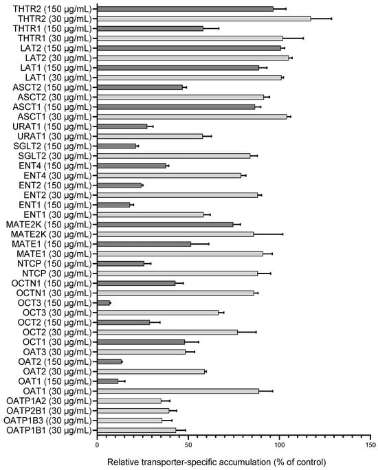 One/two-point uptake inhibition with UT extract. Relative transporter-specific transport of the validated transporter substrates in the presence of 30 or 150 µg/mL UT extract. Data are relative to the vehicle control. All data are presented as the mean ± SEM.