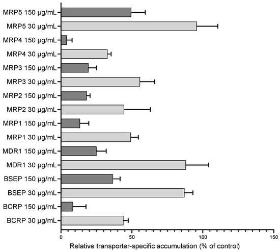 One/two-point inhibition of ABC transporters with UT extract. Relative ATP-dependent transport of the validated transporter substrates in the presence of UT extract. Data are relative to the vehicle control. All data are presented as the mean ± SEM.