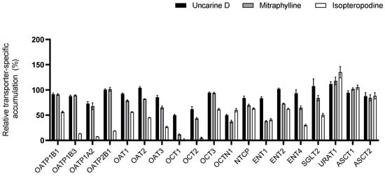 Relative transporter-specific transport of the validated SLC transporter substrates in the presence of 100 µM uncarine D, mitraphylline, or isopteropodine. Data are relative to the vehicle control. All data are presented as the mean ± SEM.