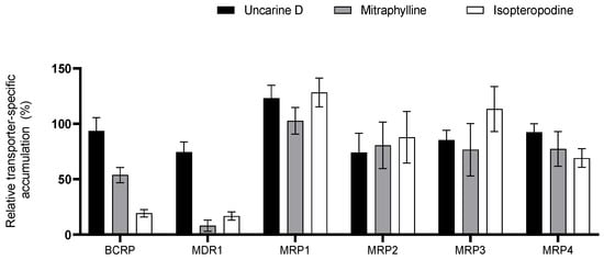 Relative transporter-specific transport of the validated ABC transporter substrates in the presence of 100 µM uncarine D, mitraphylline, or isopteropodine. Data are relative to the vehicle control. All data are presented as the mean ± SEM.