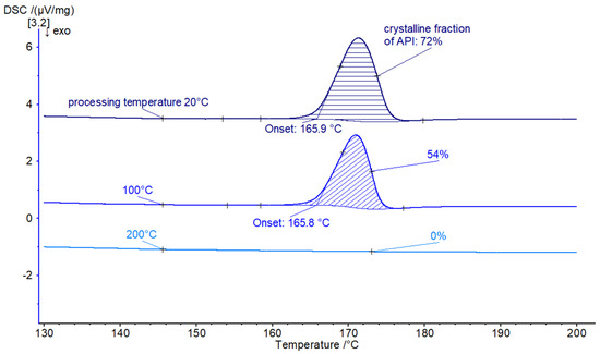 For the screw configuration sc4, the reverse elements in sc3 were replaced by a reverse mixing section (R30). The material could be processed smoothly at two different throughputs (0.1 kg/h and 0.5 kg/h), leading to a residual crystalline fraction of API of 3% and 6%, respectively, see Figure 4. For elevated temperatures (70 °C and 200 °C) full amorphization was observed. However, these DSC measurements were performed 1 month after the twin-screw processing of the samples. A small melting peak shows <0.3% residual crystalline fraction of API, which indicates recrystallization over time.