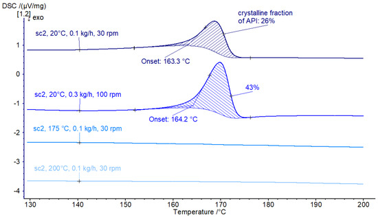 Screw configuration sc1 has two short kneading sections with F30 (forward 30°) mixing, resulting in the mildest twin-screw processing of the material in this study. Roughly 28% amorphization could be observed when processing the material with sc1 at room temperature. An increase in temperature leads to an increase in amorphization (see Figure 2), resulting in a complete amorphization at a processing temperature of 200 °C.