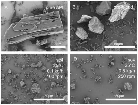 SEM images of (A) pure itraconazole, (B) pre-blend of mesoporous silica and itraconazole, granules produced by twin-screw granulation at (C) 25 °C, 100 rpm screw speed and 0.1 kg/h throughput, and (D) at 25 °C, 250 rpm screw speed and 0.5 kg/h throughput. Unprocessed SEM pictures can be found in the Supplementary Figure S2A–D.