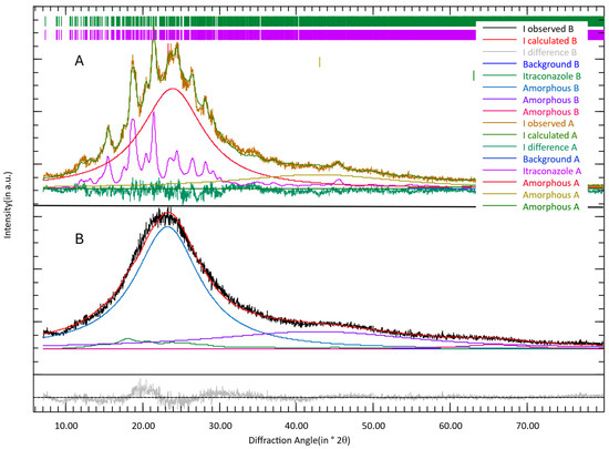 Figure 6 shows the XRD patterns of the granulate processed with sc4 at 25 °C (A) and 70 °C (B) with 0.5 kg/h throughput. In pattern A (25 °C), reflections corresponding to crystalline itraconazole are visible (in pink). The refinement yields 60 wt% amorphous content and 40 wt% crystalline itraconazole (80 wt% of the initial itraconazole). A crystallite size of 15 nm is determined from the diffraction peak broadening [20] with a strong indication of a broad size distribution [19]. Pattern B (70°) exhibits no distinct reflections, but the broad peak at ~22° 2θ cannot be explained by an amorphous phase only. Therefore, itraconazole was added to the refinement, which significantly increases the statistical parameters. The itraconazole has a very small crystallite size of 4 nm with an indication of a broad size distribution and constitutes 14 wt% of the sample (28% of the initial itraconazole) with 86 wt% of amorphous content. The XRD analysis of the pure mesoporous silica (Syloid) confirmed a complete amorphous structure. Determined by XRD 2 months after processing, the residual crystallinity of the API is 80% when processed at 25 °C and 0.5 kg/h throughput, and 44% when processed at 25 °C and 0.1 kg/h throughput. In the sample produced at 70 °C, only API with a very low crystallite size was traced.