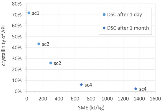 Based on the data collected for the different screw configurations and process settings, a dependency of API crystallinity on the specific mechanic energy (SME) introduced into the material can be seen. Figure 7 shows a graph summarizing all DSC data collected for samples processed at room temperature. The residual crystallinity after the twin-screw granulation process clearly decreases with an increasing SME.