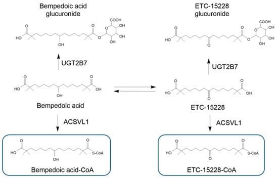 Bempedoic acid and its metabolites are not substrates or inhibitors/inducers of cytochrome P450 (CYP450) involved in drug metabolism but are metabolized through conjugation with glucuronic acid by UDP-Glucuronosyltransferase-2B7 (UGT2B7) (Figure 2) [15,20]. Based on AUCinf exposure, the metabolites bempedoic acid–glucuronide, ETC15228, and ETC15228–glucuronide represent approximately 28.9%, 12.1%, and 10.4%, respectively, of the total plasma radioactivity detectable after administration of 180 mg of [14C]–bempedoic acid [20].