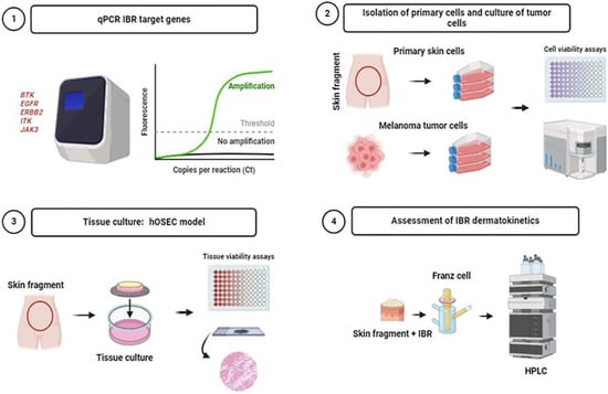 Experimental design. This study included 4 different phases. 1. qRT-PCR of IBR target genes was performed to evaluate the expression of these genes in primary human skin and melanoma cells. 2. Human primary keratinocytes and fibroblasts were isolated and treated with increasing concentrations of IBR to carry out MTT metabolization and apoptosis detection assays. Melanoma cells were also investigated. 3. hOSEC models were used to determine the toxicity and irritation profile of IBR applied topically and in the tissue culture media at different concentrations. The TTC metabolization assay was performed, and the skin irritation score was determined using histology. 4. Assessment of IBR dermatokinetics in hOSECs. Drug permeation was determined after 12 and 24 h of IBR application using HPLC.
