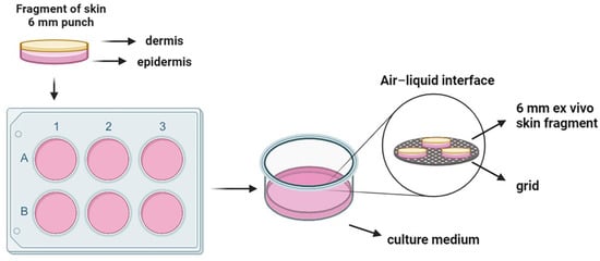The skin was disinfected, and the hypodermis was removed. Then, it was sectioned with 6 mm punches. The fragments were positioned on top of a sterile metal grid in 6-well plates, maintaining the dermis in contact with the culture medium (DMEM supplemented with 10% FBS and 1% penicillin/streptomycin) and the epidermis in contact with the air (Figure 2). The fragments were incubated at 37 °C and 5% CO2 [].