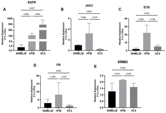 We first determined whether human primary keratinocytes and fibroblasts present IBR target genes, namely EGFR (Figure 3A), JAK3 (Figure 3B), BTK (Figure 3C), ITK (Figure 3D), and ERBB2 (Figure 3E). Through qRT-PCR, we have shown that both primary cell types present variable transcript levels of the main IBR target genes, with no statistically significant differences being detected among the cell lines. Compared to SKMEL-28, hFibs displayed a mean mRNA expression difference of 114-fold higher in EGFR, 3.2-fold higher in JAK3, 22.2-fold higher in BTK, 8.3-fold higher in ITK, and 2.1-fold higher in ERBB2. In contrast, keratinocytes exhibited a 459-fold higher mean mRNA expression in EGFR while showing a 0.7-fold decrease in JAK3, a 3.2-fold higher in BTK, a 1.7-fold decrease in ITK, and a 0.3-fold higher in ERBB2 relative to SKMEL-28.