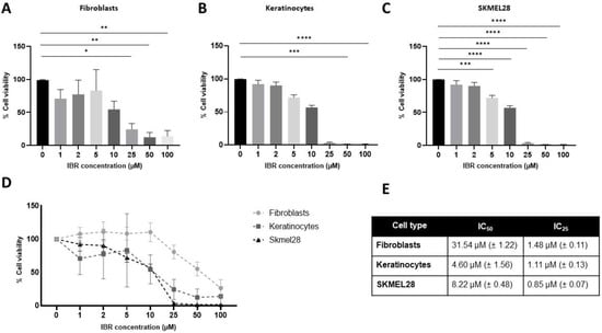 Cytotoxicity of IBR towards human primary skin cells. Human primary skin fibroblasts (A), keratinocytes (B), and SKMEL-28 cells (C) were treated with increasing doses of IBR for 48 h and had their viability assessed using the MTT assay. (D) Dose-response cytotoxicity of IBR to the different cell types tested. The data obtained from the MTT assay were used to determine the IC50 and IC25 of IBR for each cell type (E). The data are presented as the mean ± SEM. The data were analyzed using the ANOVA followed by Tukey’s post hoc test for multiple comparisons. * p < 0.05; ** p < 0.01; *** p < 0.001; **** p < 0.0001.