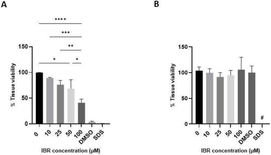 Irritation potential of IBR in hOSEC models. Human organotypic skin explant cultures were treated with increasing doses of IBR. The drug was either added in the tissue culture medium (A) or topically administered (B). After 48 h, tissue metabolic viability was assessed using the TTC assay. The data are presented as the mean ± SEM. The data were analyzed using the ANOVA followed by Tukey’s post hoc test for multiple comparisons. * p < 0.05; ** p < 0.01; *** p < 0.001; **** p < 0.0001; and # p < 0.0001 compared to all other groups.