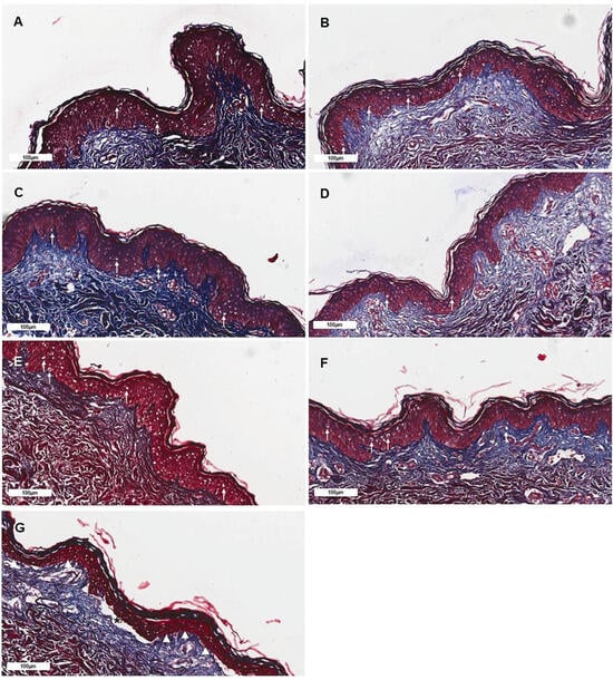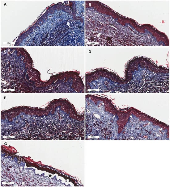 Histological observations of ex vivo skin samples treated with IBR that was added into the tissue culture medium. (A) Control group with slight peri-nuclear edema (white arrow) in the epidermis. (B) Group treated with 10 µM presenting mild peri-nuclear edema (white arrow) in the epidermis. (C) Group treated with 25 µM presenting mild peri-nuclear edema (white arrow) in the epidermis. (D) Group treated with 50 µM presenting mild peri-nuclear edema (white arrow) in the epidermis. (E) Group treated with 100 µM presenting mild peri-nuclear edema (white arrow) in the epidermis. (F) Group treated with DMSO presenting nuclear pyknosis (white arrowhead). (G) Group treated with SDS presenting necrotic skin and dermal–epidermal junction separation (asterisk). Scale bar: 100 µm. Masson’s trichrome.