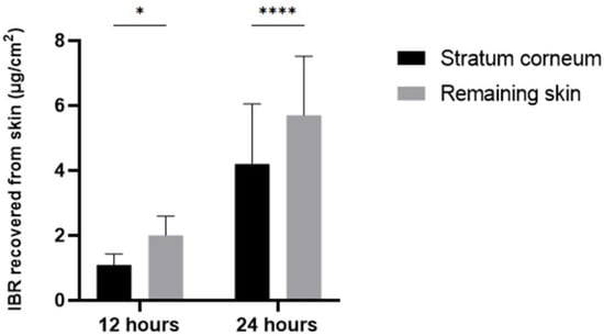IBR dermatokinetics analysis in human skin. IBR was topically administered in human skin samples. The amount of drug recovered from the stratum corneum and remaining skin after 12 and 24 h was determined using the HPLC method. The data are presented as the mean ± SEM. The data were analyzed using a two-way ANOVA followed by Sidak’s post hoc test for multiple comparisons; * p < 0.05; **** p < 0.001.