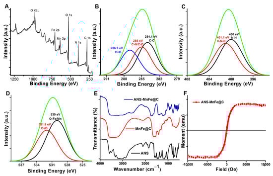 (A) XPS analysis of MnFe@C. (B–D) Deconvoluted XPS spectra of C 1s, N 1s, and O 1s, respectively. (E) FTIR spectra of ANS, MnFe@C, and ANS-MnFe@C. (F) Room temperature magnetic hysteresis loop of ANS-MnFe@C.