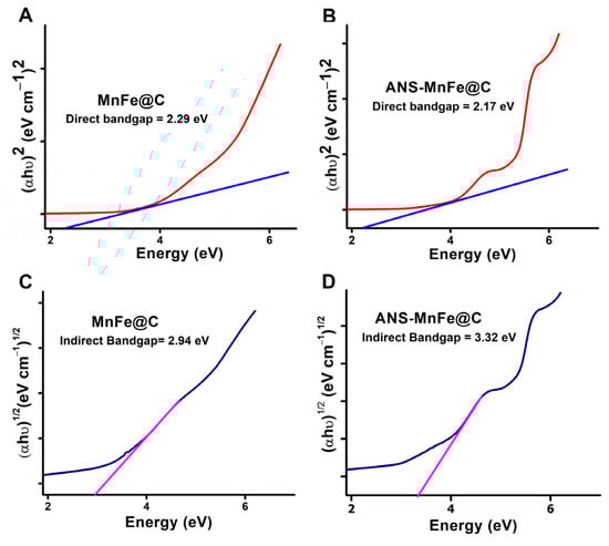 The extrapolation of (αhυ)2 (eVcm−1)2 and (αhυ)1/2 (eVcm−1)1/2 vs. energy (eV) graphs (Figure 4) determined the optical bandgap energy of MnFe@C and ANS-MnFe@C. The linear and nonlinear part of the curves showed the allowed transition characteristics. The Tauc method relies on a traced tangent line just before the linear region of the curve. For direct allowed electron transitions (Figure 4A,B) and indirect allowed electron transitions (Figure 4C,D), the intercept of the extrapolated linear part of the plot (αhυ)γ against hυ with abscissa helped to determine the Eg value.
