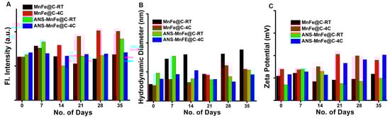 The stability of the MnFe@C and ANS-MnFe@C was examined using a spectrofluorimeter and dynamic scattering analysis at a different storage temperatures of 4 °C and 30 ± 3 °C (room temperature). The measurements were conducted at 7-day intervals over 35 days to track changes in the emission intensity, hydrodynamic diameter, and surface charge.