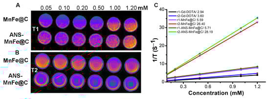 (A) T1-weighted and (B) T2-weighted phantom images of MnFe@C and ANS-MnFe@C with increasing concentrations. (C) The calculated relaxivity was plotted against the concentration and compared with commercially available Gd-DOTA.