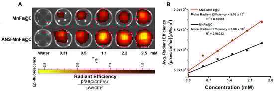 (A) Phantom optical images of MnFe@C and ANS-MnFe@C with different concentrations. (B) The molar radiant efficiencies were determined by plotting fluorescence image intensities against the concentration.