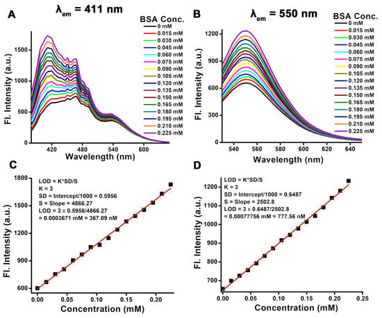 Fluorescence emission spectra of ANS-MnFe@C show the increasing intensity upon the addition of an increasing amount of the BSA protein. (A) λex = 365 nm and λem = 411 nm, (B) λex = 515 nm and λem = 550 nm. (C,D) The fluorescence intensity was plotted against the concentration for λem = 411 nm and λem = 550 nm, respectively.