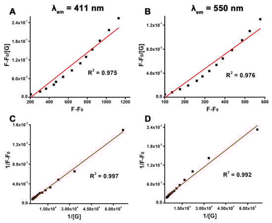 (A,B) Scatchard plots for ANS-MnFe@C and BSA binding monitored at λem = 411 and 550 nm, respectively. (C,D) Benesi–Hildebrand (BH) plots of ANS-MnFe@C in the presence of BSA monitored at λem = 411 and 550 nm, respectively.