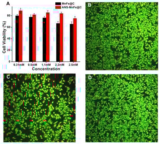 (A) Viability of A375 cells treated with different concentrations (0.31, 0.5, 1.1, 2.2, and 2.5 mM) of ANS-conjugated and unconjugated MnFe@C; fluorescence images of AO/EtBr-stained (10× magnification) A375 cells: (B) control; (C) MnFe@C; and (D) ANS-MnFe@C.