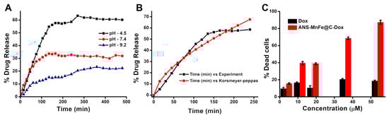 (A) Drug release profile for-Dox loaded ANS-MnFe@C in different release media (pH 4.5, 7.5, and 9.2). (B) The Korsmeyer–Peppas model was used to profile Dox release from ANS-MnFe@C. (C) Percentage of A549 cells killed after treatment with Dox and ANS-MnFe@C-Dox.