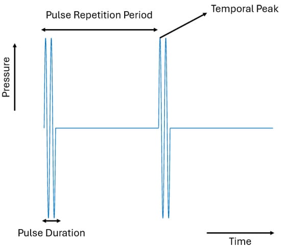 An ultrasound transducer generates single pulses, each of which is comprised of multiple cycles, as shown in Figure 1, which results in intensity variations within the pulse. Three measurements can be used to characterize these temporal variations: (1) the temporal peak, (2) the pulse average, and (3) the temporal average. When the ultrasonic wave pulse reaches its maximum amplitude, a measurement known as the temporal peak is taken, which characterizes the maximum intensity attained during a single pulse. The ultrasound wave’s average intensity over the course of a single pulse is known as the pulse average measure. In the temporal average measurement, the ultrasonic wave’s intensity is averaged over the pulse repetition period. As a result, this measure records the lowest intensity since it captures both the intensity during the pulse’s application and the period of time between that pulse and the next in the sequence during which no intensity is present.