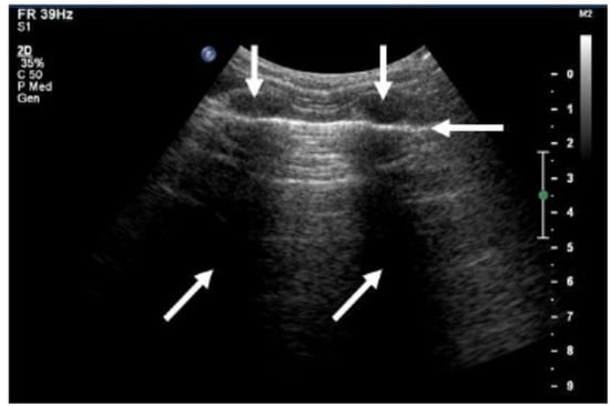 Sonic shadows produced by two adjacent bones in the rib cage. The ultrasound image shows two neighboring ribs (vertical arrows), a hyperechogenic pleural line (horizontal arrow), and acoustic shadows below (oblique arrows) (Retrieved with open access permission from reference [20]).