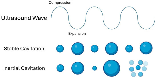 Cavitation exists in two forms (shown in Figure 4): (1) stable cavitation and (2) inertial cavitation. The type of cavitation that occurs is determined by a number of factors, including US frequency, pressure, surface tension, and space availability. The likelihood of a cavitation event corresponds with the peak negative pressure and the ultrasound wave’s frequency. Bubbles that reach their resonance size and begin to oscillate linearly at the same frequency as the applied ultrasound wave around an equilibrium (resonance size) are said to exhibit stable cavitation [25,26]. The ultrasound wave’s frequency must match the bubble’s resonance frequency, which depends on the bubble’s radius, for stable cavitation to occur [10]. On the other hand, inertial cavitation happens at higher negative peak pressures, as it is the bubbles reacting to the stimulating ultrasound wave in a non-linear manner that causes asymmetrical oscillation and the bubble to collapse [27,28].