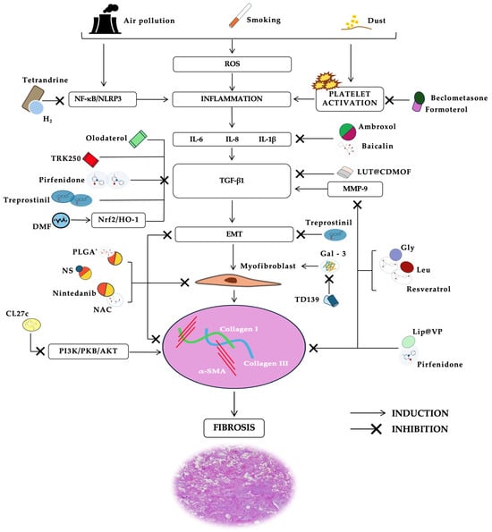 Inhaling molecules under investigation in pulmonary fibrosis treatment. Smoking, air pollution, and dust represent the main noxae involved in ROS production and inflammation ignited within the lungs. This eventually may lead to a sustained aberrant response of alveolar epithelial cells leading EMT to progress and, finally, to fibrosis and lung parenchyma destruction. Several inhaling molecules are currently under investigation for future employment in pulmonary fibrosis treatment. *: PLGA–nintedanib has currently only been tested in vitro, by Wang et al. [36]. α-SMA: alpha-smooth muscle actin; DMF: dimethyl fumarate; Gal-3: galectin 3; Gly: glycine; EMT: epithelial–mesenchymal transition; HO-1: heme oxygenase 1; Leu: leucine; Lip@VP: Liposome@verteporfin/pirfenidone; LUT@CDMOFs: Luteolin into γ-cyclodextrin metal–organic frameworks; MMP-9: matrix metalloproteinase-9; NAC: N-acetyl cysteine; NF-κB: nuclear factor kappa B; NLRP3: NLR family pyrin domain-containing 3; Nrf2: nuclear factor erythroid factor 2-related factor 2; NS: nanosuspension; PI3Ks: phosphoinositide 3-kinases; PKB: protein kinase B; PLGA: poly lactic-co-glycolic acid; ROS: reactive oxygen species; TD139: thiodigalactoside galectin-3 inhibitor; TGF-β1: transforming growth factor beta 1.