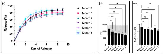 For drug release, there was no significant difference in the release profiles for samples from months 1, 4, and 5 compared to month 0 (