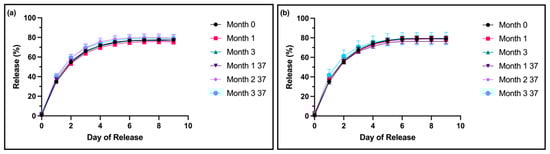 Figure 5a). There were no significant differences in release profiles of thixogels stored for three months at room temperature and 37 °C (~8.5 months real time) compared to month 0 (