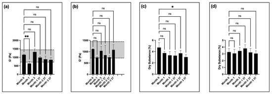 The rheological data revealed significant differences in the storage moduli of the samples at all timepoints compared to month 0, with the stiffness values falling below the low end of the specifications at month 3 of room-temperature storage and month 1 of storage at 37 °C (equivalent to ~3 months of real time) (
