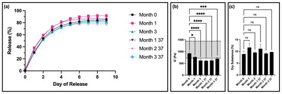 Figure 5a). Thixogels stored at 37 °C for two months (corresponding to ~5.5 months of real time) had significant differences in release compared to month 0 on days 8 and 9 (