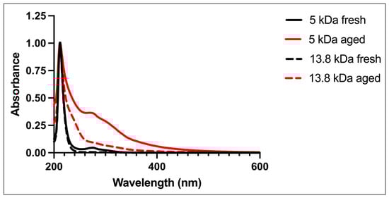 25]. The fresh 5 kDa solution exhibited a peak at ~280 nm that was not observed in the fresh 13.8 kDa HA solutions. The spectra of the aged 5 kDa and 13.8 kDa HA solutions both showed the ~280 nm peak, along with increased absorbance in the 240 nm region and the 400–550 nm region.
