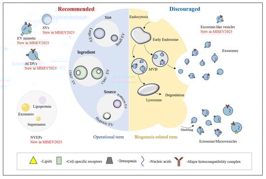 Figure 1 shows the recommended and discouraged extracellular particle (EP) nomenclature in MISEV2023. A comparative display of MISEV terminology is shown in Table 1. Regarding the definition of EVs, it can be found that with the update of MISEV, the 2018 edition is the most stringent in defining EVs, as the 2023 edition deleted the term “naturally” to avoid inadvertent exclusion of engineered EVs or EVs produced in a variety of cell culture conditions. In terms of nomenclature, MISEV2023’s recommended EV nomenclature is basically the same as the previous version, and it also emphasizes the “non-vesicular extracellular particles” (NVEPs), such as “lipoproteins”, “exomeres” and “supermeres” [7,8], that are enriched in most EV formulations. Therefore, it is important to provide more detailed recommended guidance on the nomenclature of EV subtypes and NVEPs in order to avoid misuse of biogenesis terms such as “exosomes”, “ectosomes” and “microvesicles”.