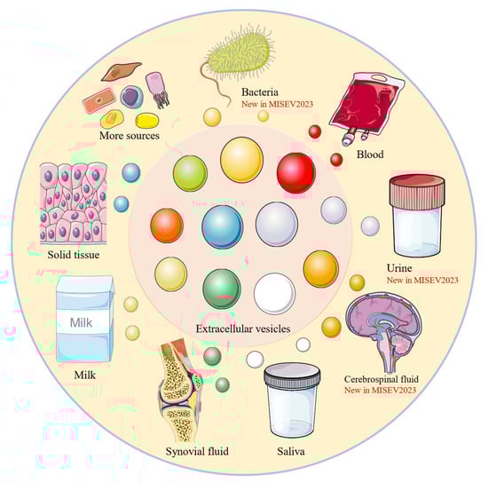 - Welsh, J.A.; Goberdhan, D.C.; O’Driscoll, L.; Théry, C.; Witwer, K.W. MISEV2023: An updated guide to EV research and applications. J. Extracell. Vesicles 2024, 13, e12416. [Google Scholar] [CrossRef] [PubMed]