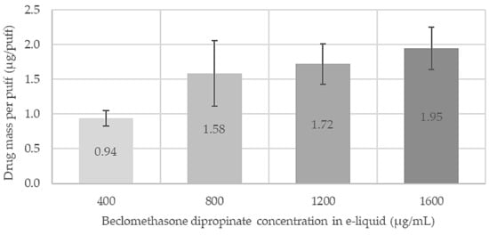 The amount of active ingredient delivered in a single puff of the VDDS at different concentrations of beclomethasone dipropionate in the e-liquid is presented in Figure 2. Data are presented as the mean ± standard deviation from three independent experiments. The plot shows the drug mass per puff calculated by dividing the total respirable dose delivered by the VDDS by the number of puffs performed (40 puffs in these specific experimental conditions). Interestingly, the drug mass per puff almost doubles (0.94 ± 0.11 to 1.58 ± 0.47 µg/puff) when the drug concentration in the e-liquid increases from 400 to 800 µg/mL. At higher concentrations, the mass of drug per puff begins to stagnate, increasing only slightly from 1.72 ± 0.29 to 1.95 ± 0.31 µg/puff at the initial drug concentration in the e-liquid of 1200 and 1600 µg/mL, respectively. Overall, these results showed that the VDDS was able to deliver quantifiable and increasing respirable doses of beclomethasone dipropionate depending on the initial drug concentration in the e-liquid.
