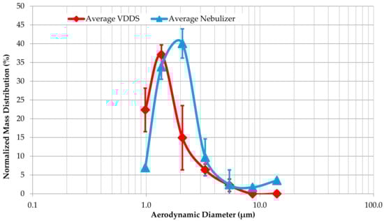 Comparison of normalized mass distribution between vaping drug delivery system (VDDS) and nebulizer. Data are presented as mean ± standard deviation for each point from three independent experiments.